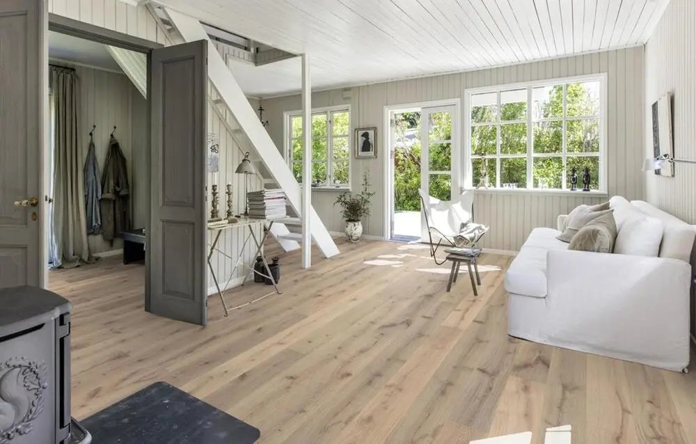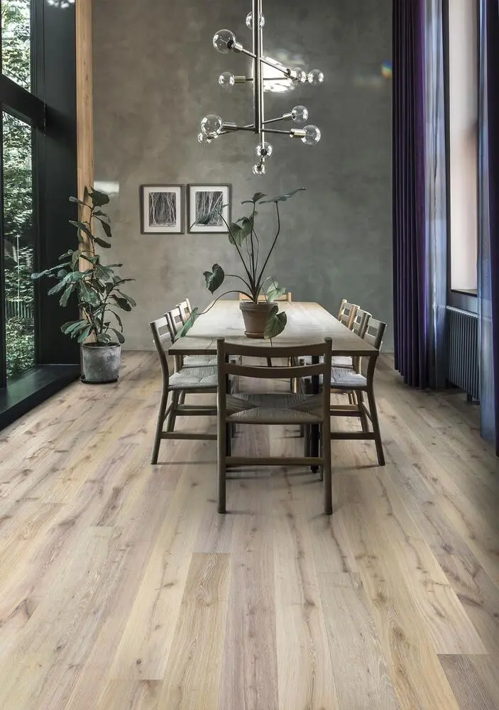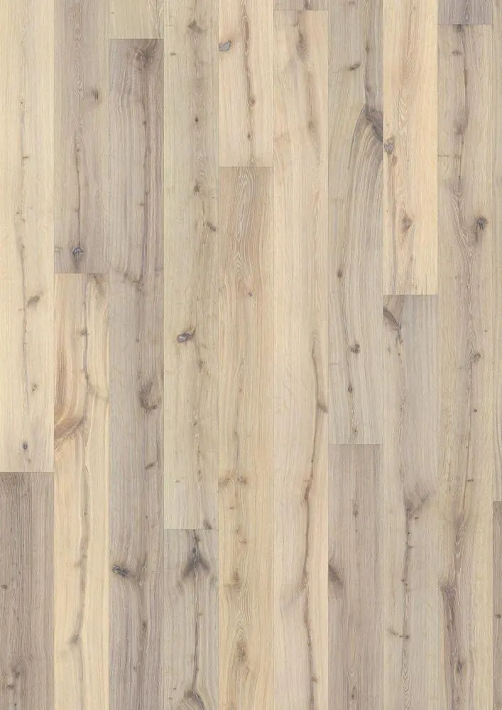 En dæmpet blond nuance suppleres af varmgrå toner på dette 1-stavs egetræsgulv fra Boardwalk-kollektionen. En livlig spredning af knaster i forskellige størrelser fremhæves med håndbørstning, mens fas på alle fire sider skaber et klassisk plankelook.