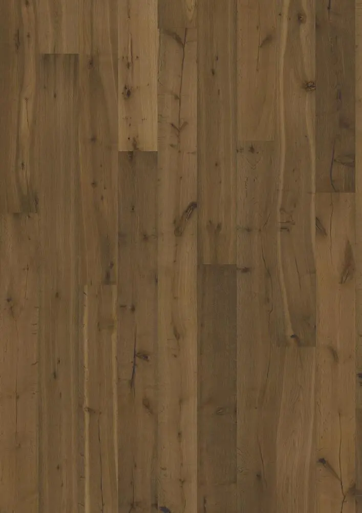 Dette 1-stavs egetræsgulv fra Boardwalk Collection skaber et rustikt udtryk med sin varme honningnuance og kastanjebrune åretegning. Karakterfulde knaster tilfører struktur, som vækkes til live gennem håndbørstning. Fasede kanter på alle fire sider skaber et klassisk fuldplanke-udtryk.