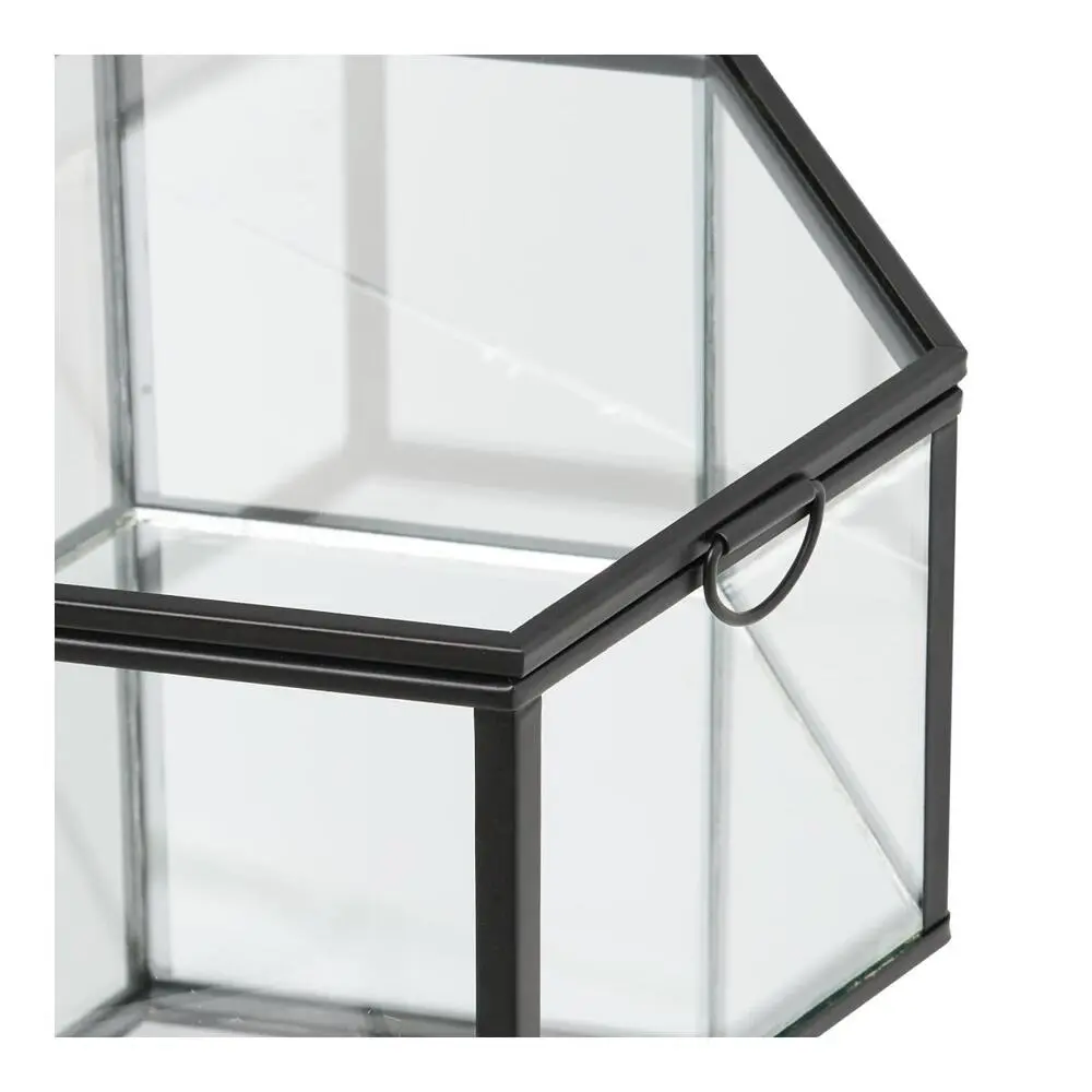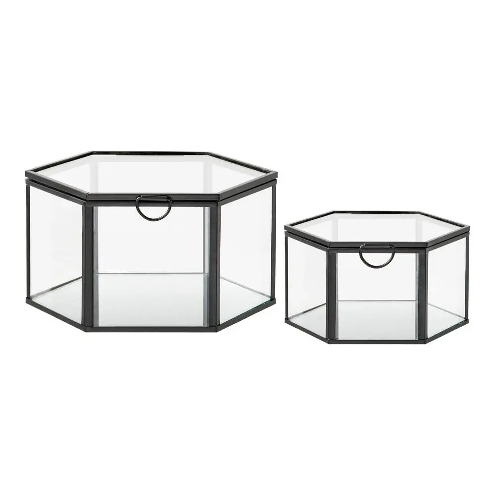 Dekorations bokse i klart glas og sort metal.