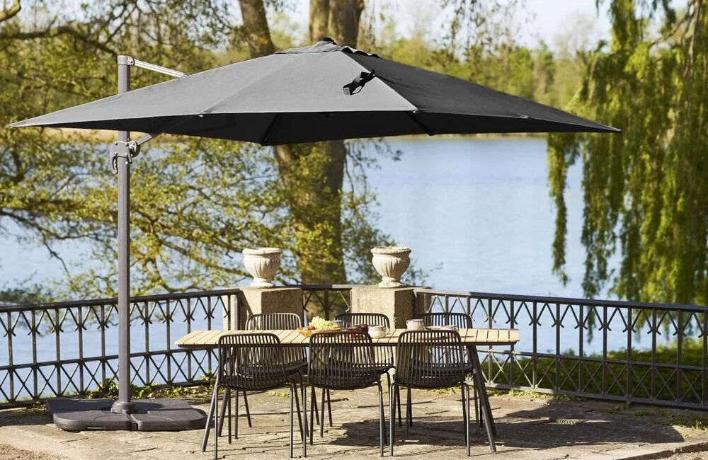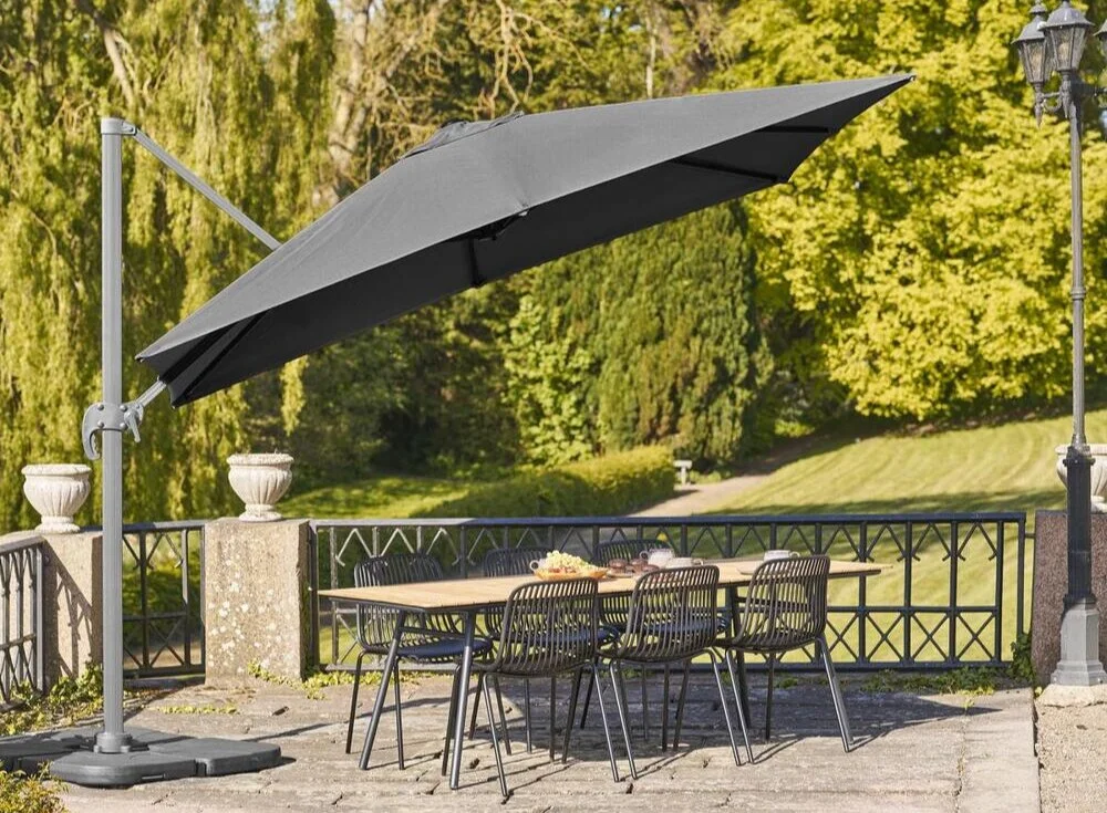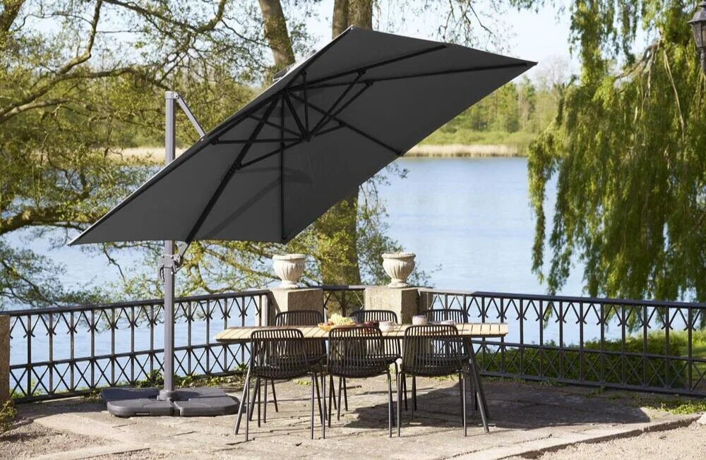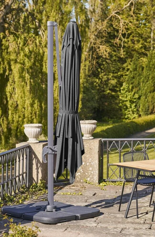 Sort hængeparasol med fod og aluminium stok.