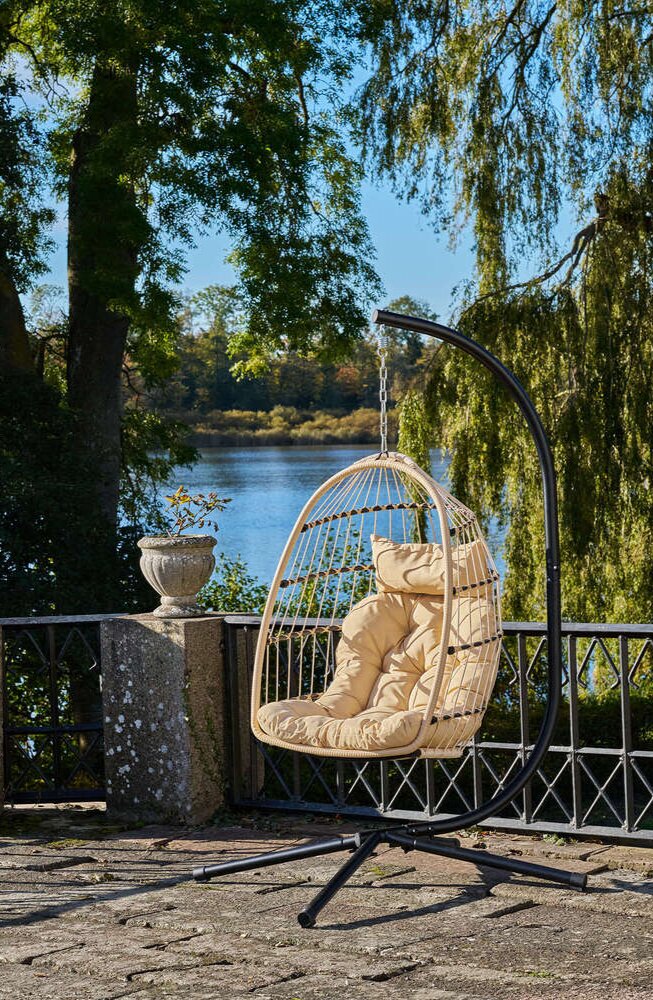 Hængestol med stål stativ. Foldbar sæde inkl. hynde i natur og sort.