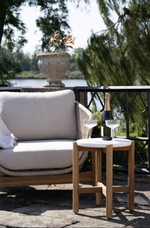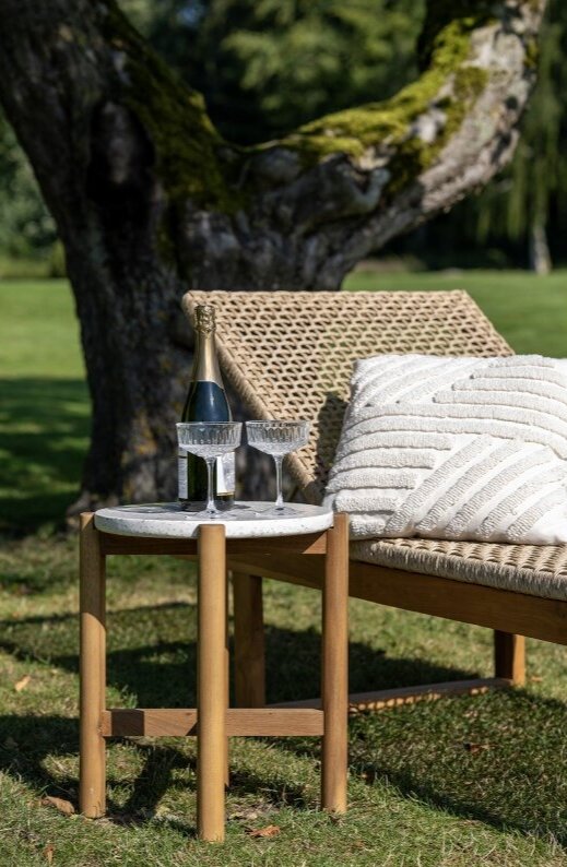 Naturfarvet hjørnebord i akacietræ og terrazzo bordplade.
