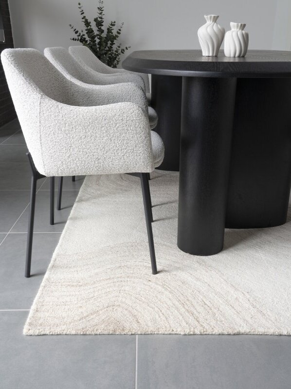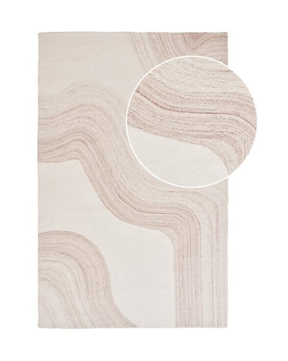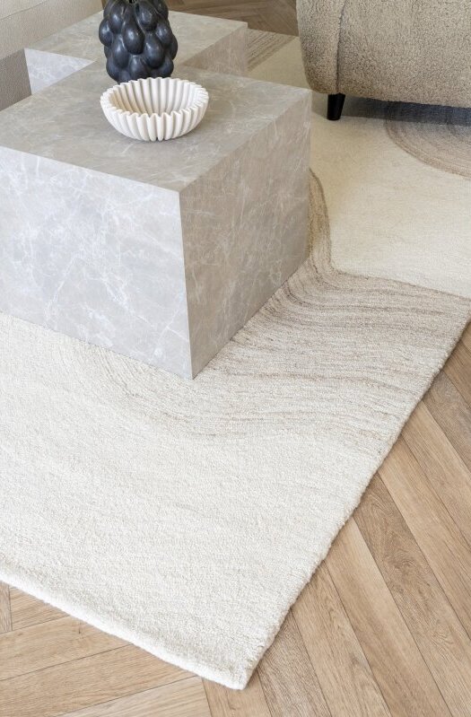 Tæppe som er håndtuftet i lysebrun/råhvide farver.