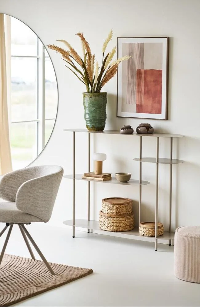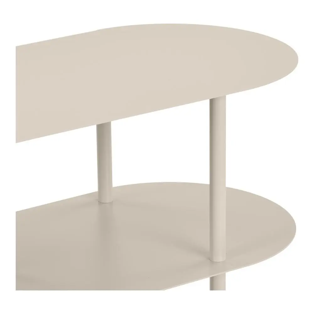 Asymmetrisk sandfarvet metal reol med 4 hylder.
