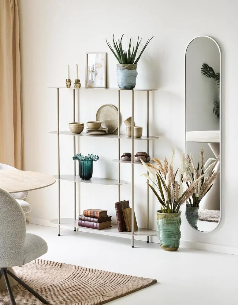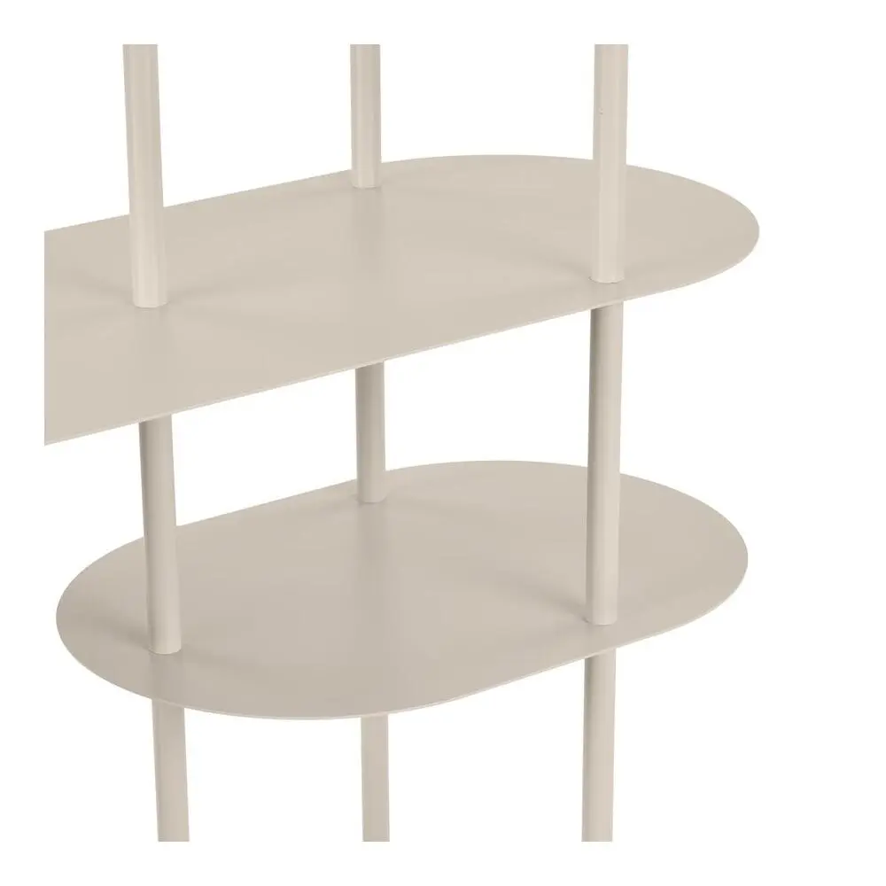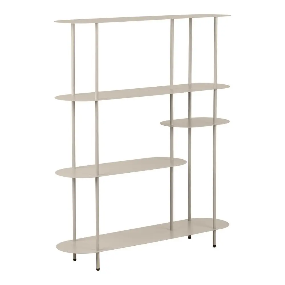 Asymmetrisk sandfarvet metal reol med 5 hylder.