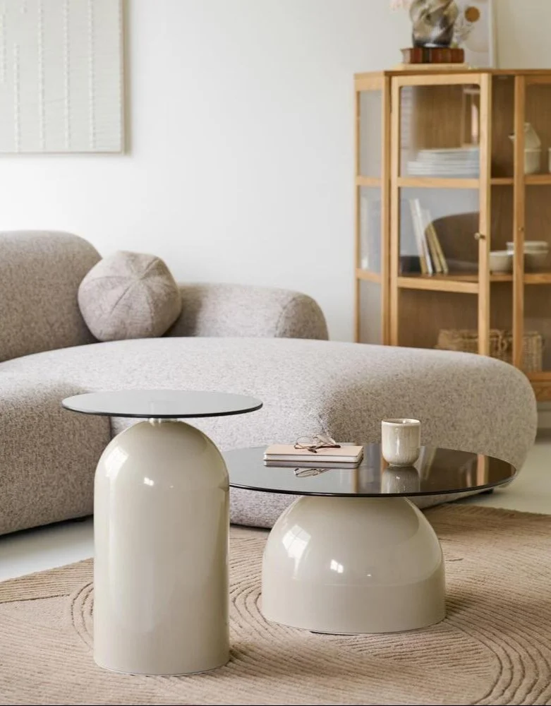 Beigefarvet sofabord med hærdet glas.