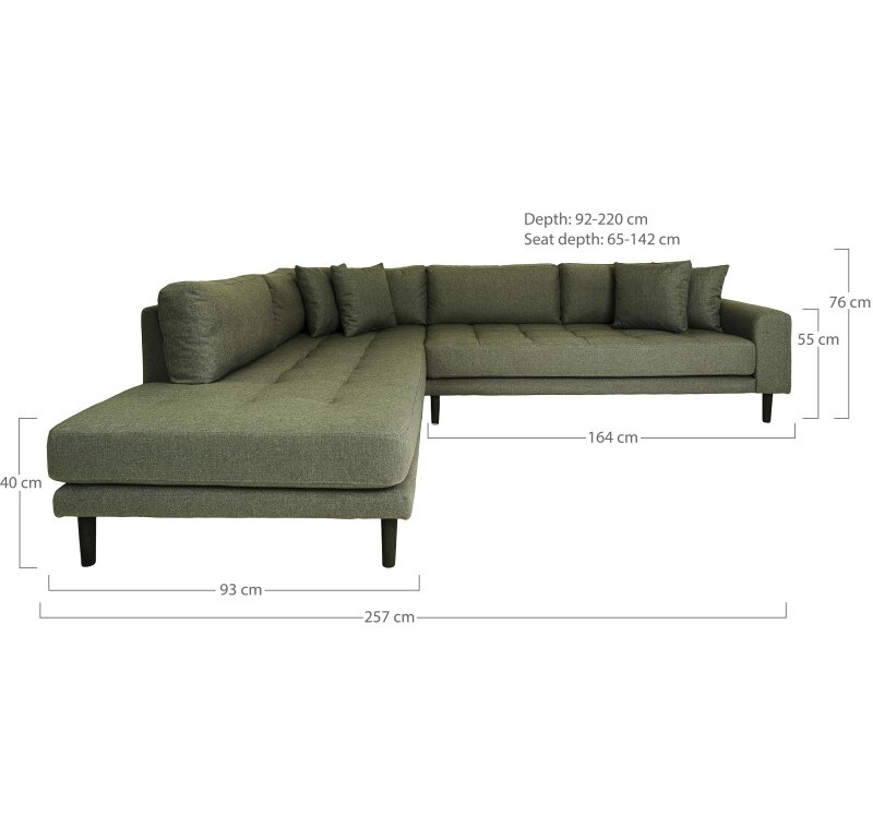Hjørnesofa med åben ende, venstre- og højrevendt i olivengrøn med fire puder og sorte træben.