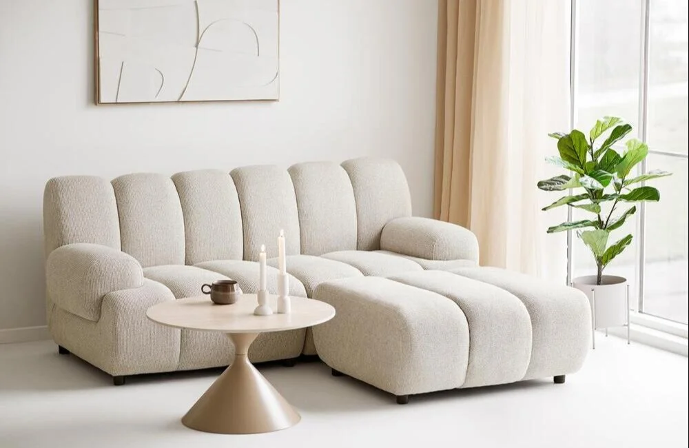 Sandfarvet højrevendt 2,5 personers modulsofa.