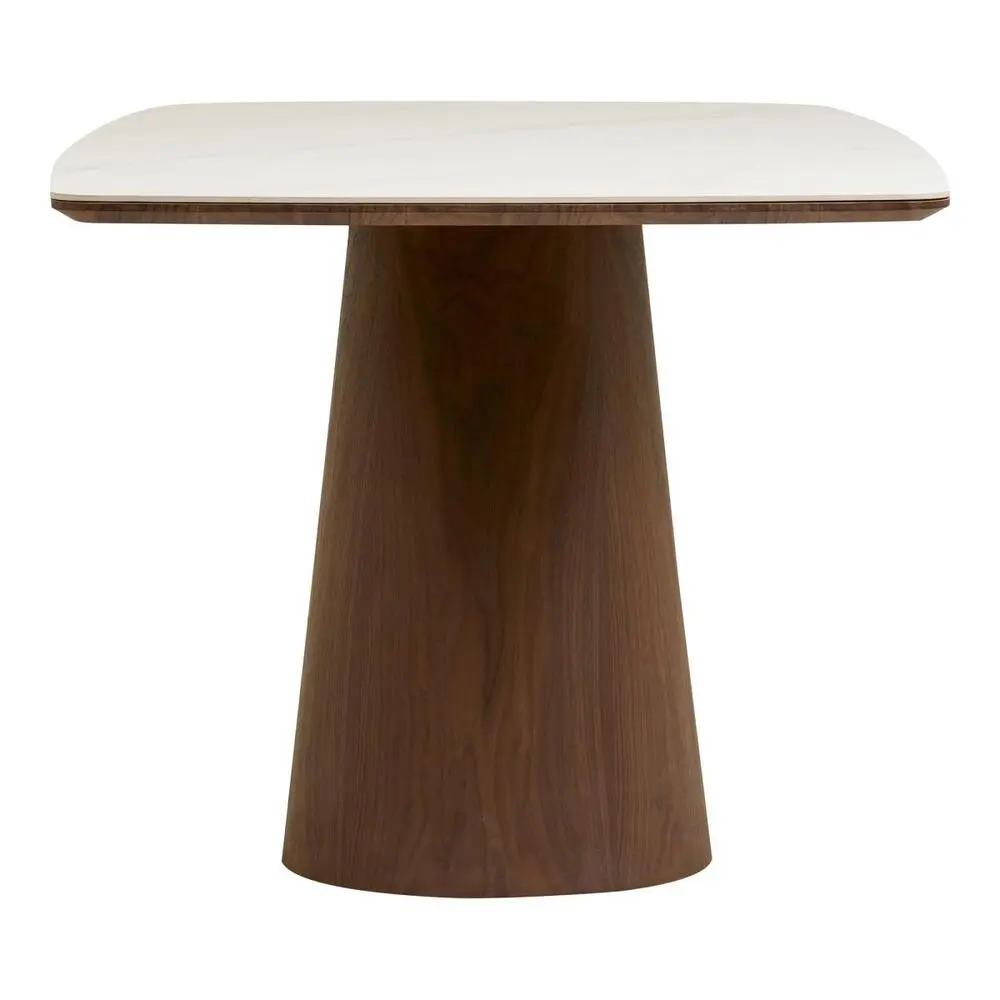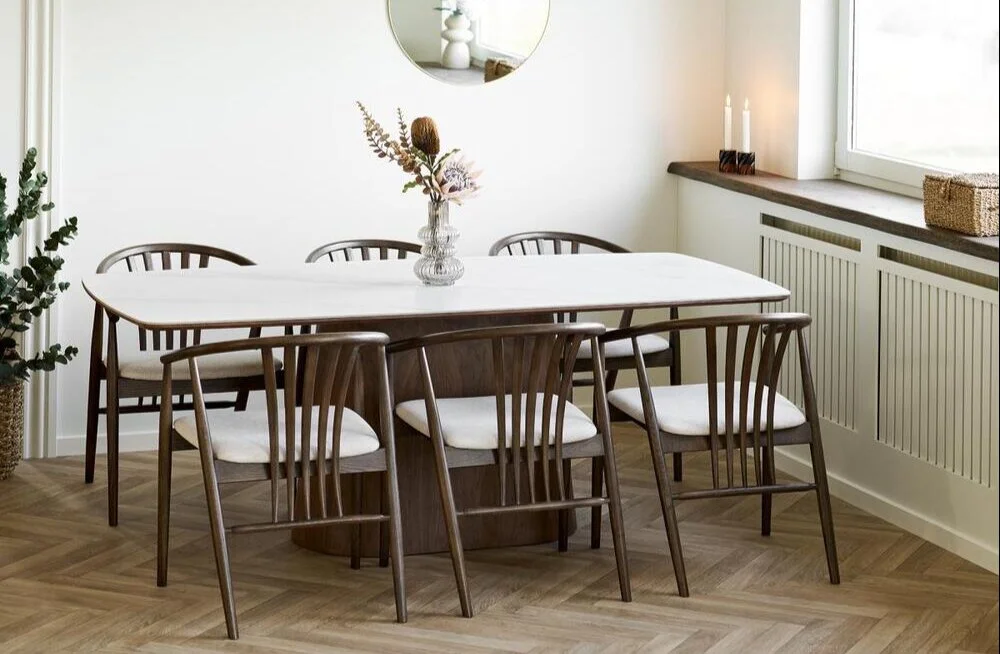Spisebord, keramisk bordplade og mørkebrun askefiner.