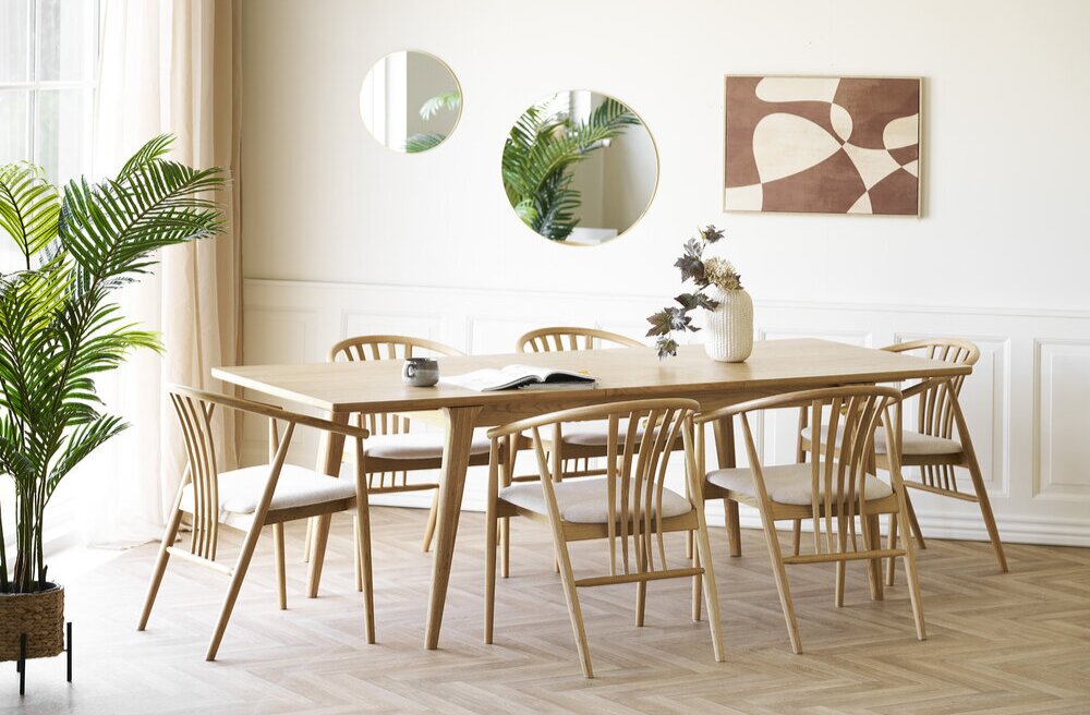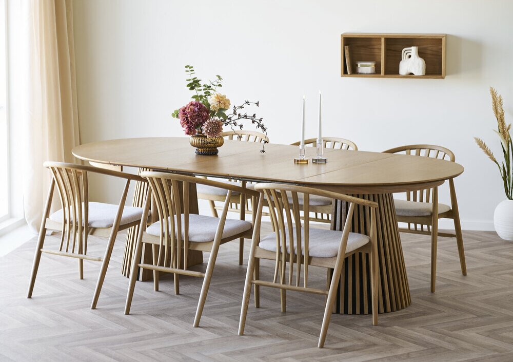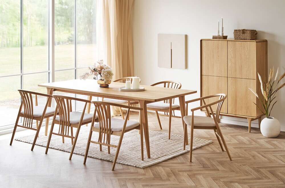 Spisebordsstol i egetræ med sandfarvet sæde.
