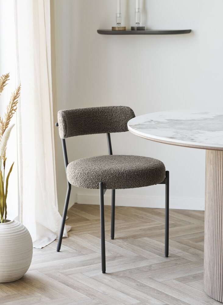 Brun spisebordsstol i bouclé med sorte ben.