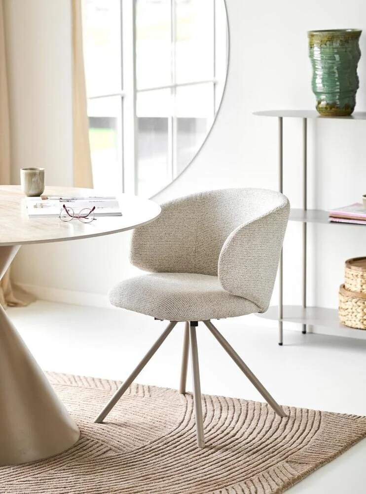 Spisebordsstol med sandfarvede ben og beklædt med sandfarvet stof.