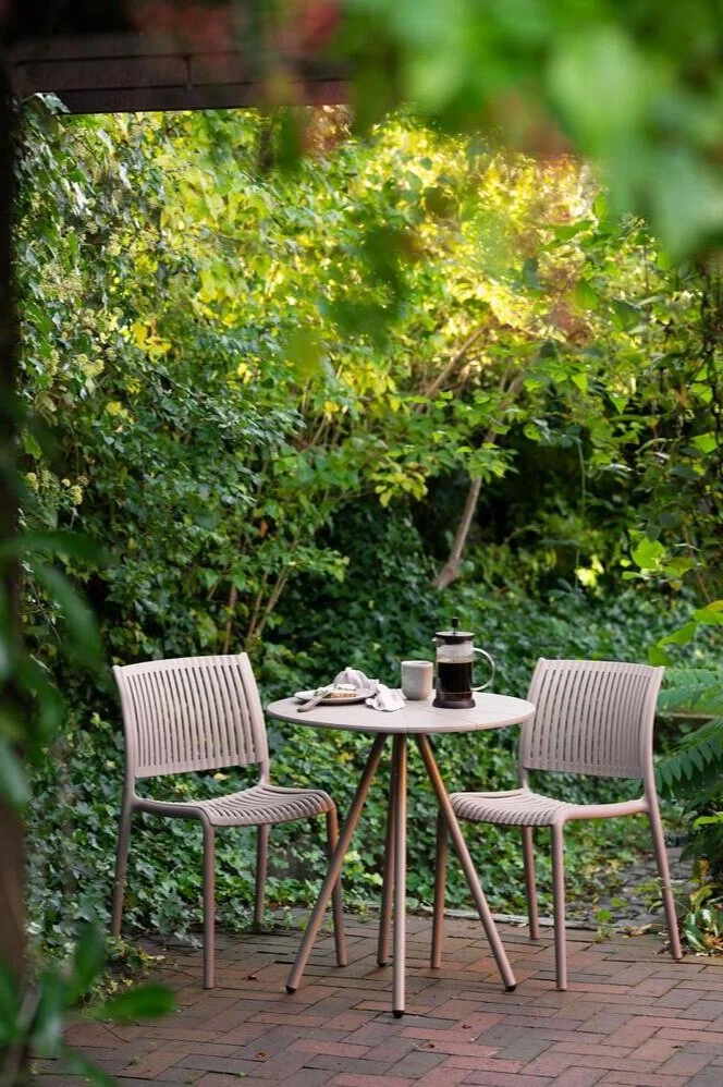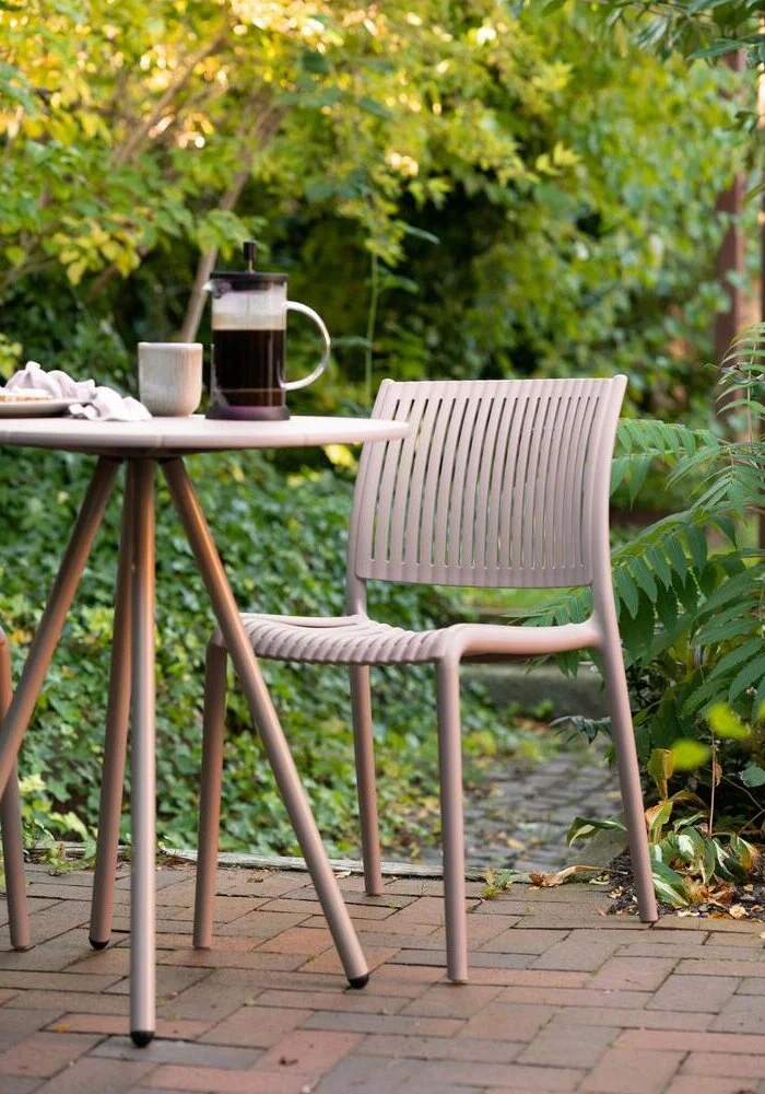Stabelbar spisebordsstol i polypropylen og farven taupe.