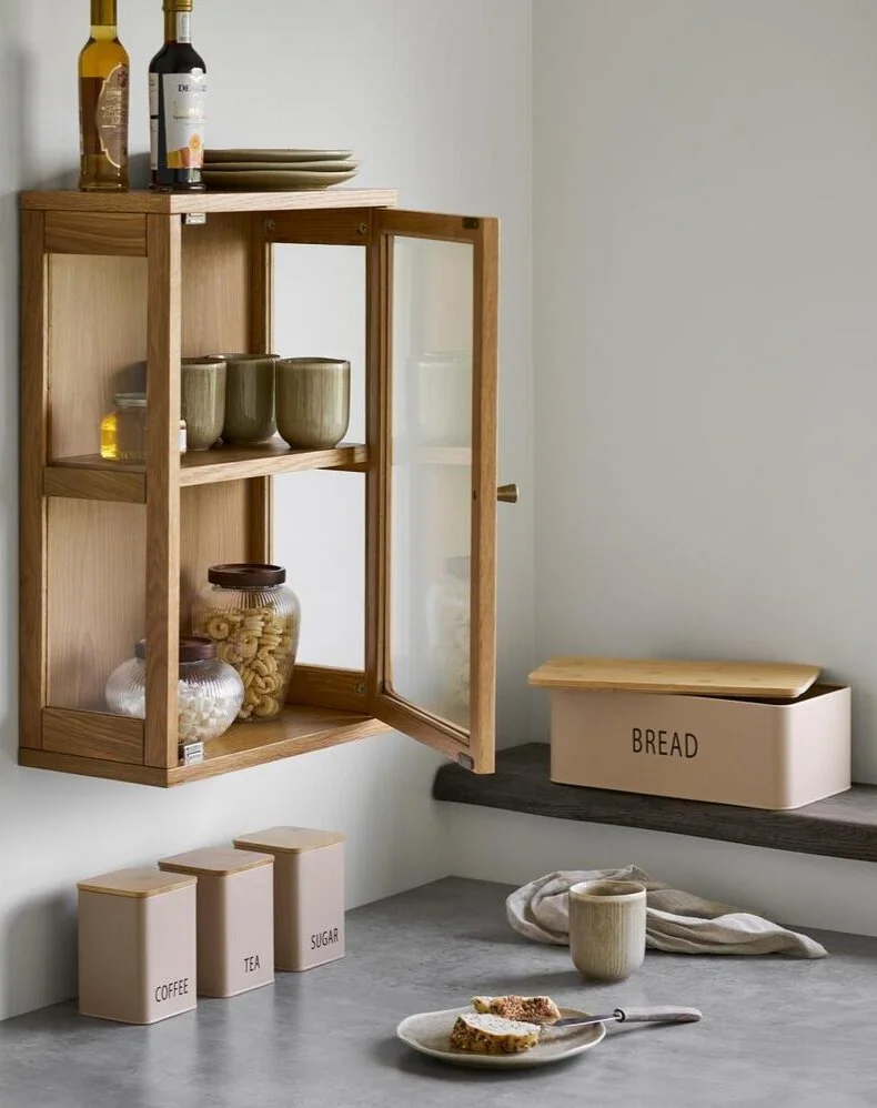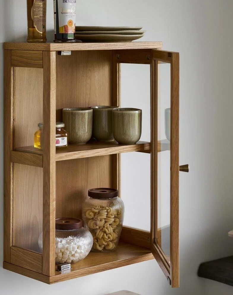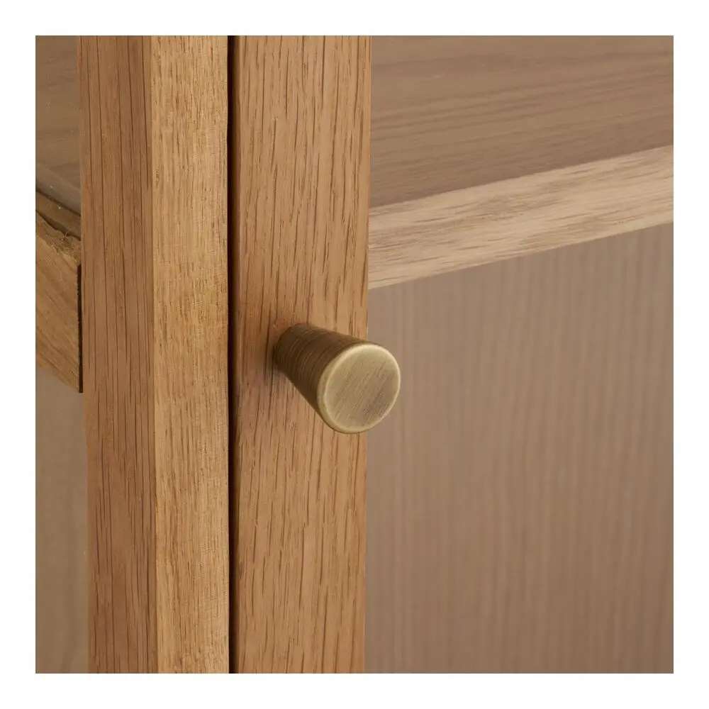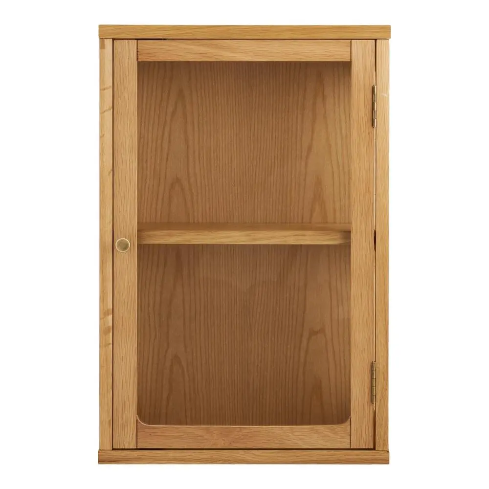 Vitrineskab i egefiner og med 1 glaslåge med hærdet glas samt 1 hylde i egefiner.