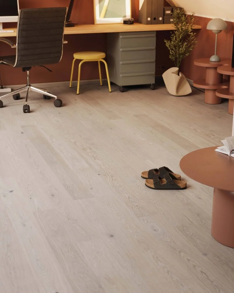 Et smukt og stilrent look. Dalen er et lyst, matlakeret gulv i hærdet træ, som er populært i Skandinavien. Den rene nuance Powder White gør rummet ekstra lyst, og sorteringen Blend, som har lidt farvevariationer, giver gulvet karakter. Dette klasse 33-produkt er fremstillet af FSC-certificeret europæisk eg og er ekstremt slidstærkt og derfor velegnet til rum med meget gangtrafik såsom hoteller, butikker, kontorer og caféer – eller entréen i dit hjem. Den matlakerede finish gør gulvet nemt at vedligeholde og beskytter samtidig mod pletter.