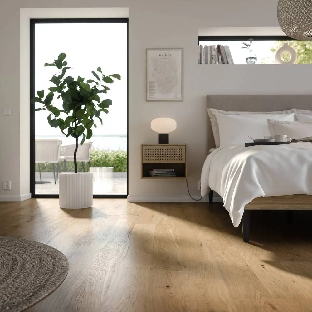 Et klassisk, svensk gulv. Skogen er et klassisk, matlakeret gulv i hærdet træ i et tidløst, skandinavisk design. Nuancen Natural er alsidig, og sorteringen Blend, som har lidt farvevariationer, giver gulvet karakter. Dette klasse 33-produkt er fremstillet af FSC-certificeret europæisk eg og er ekstremt slidstærkt og derfor velegnet til rum med meget gangtrafik såsom hoteller, butikker, kontorer og caféer – eller entréen i dit hjem. Den matlakerede finish gør gulvet nemt at vedligeholde og beskytter samtidig mod pletter.